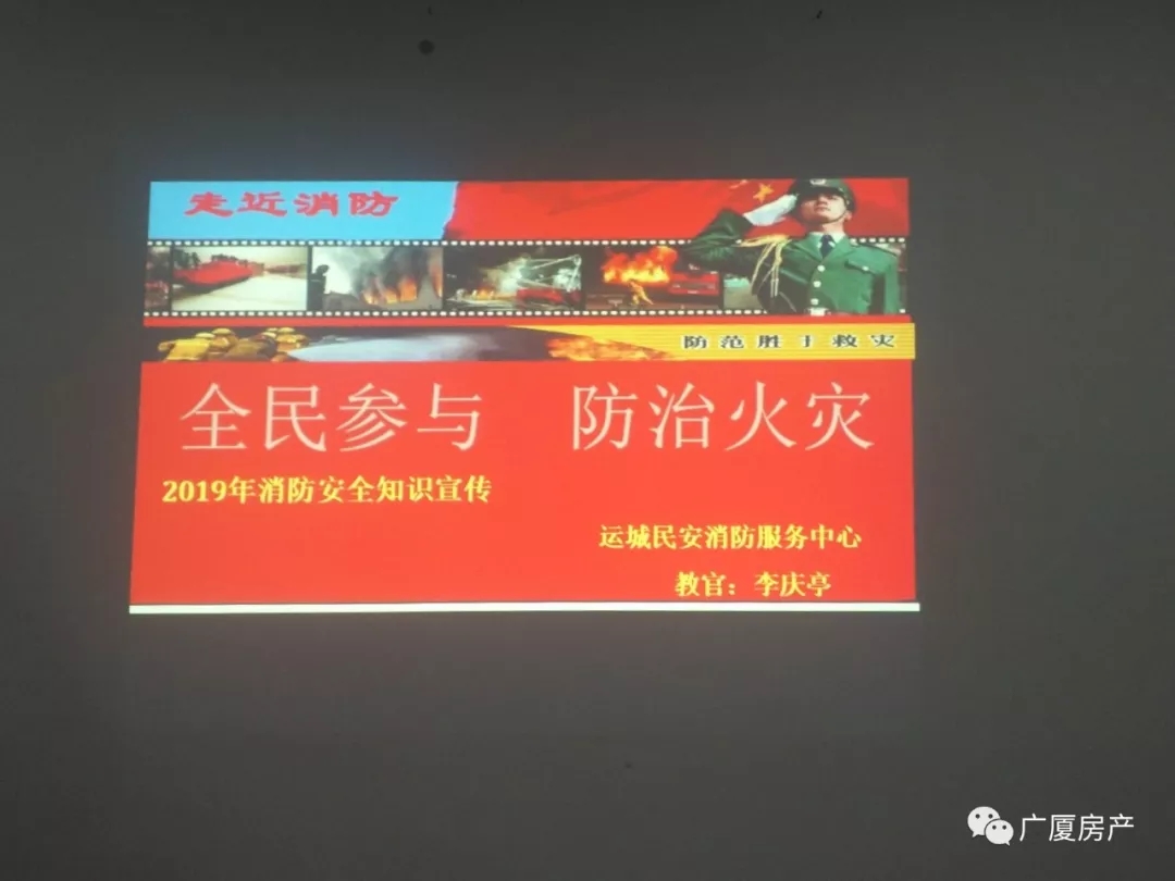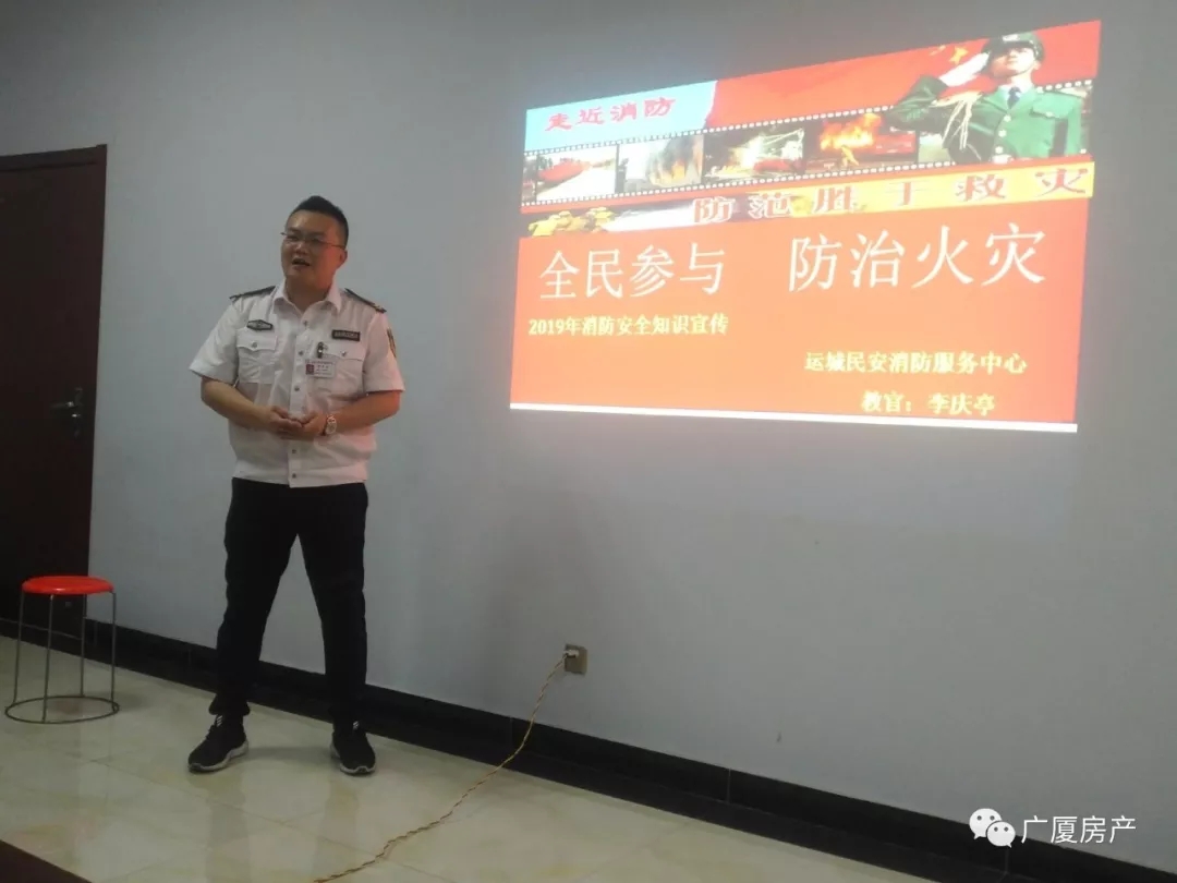 運城民安消防服務(wù)中心李慶亭教官給物業(yè)部門人員講解消防知識,并給大家講了一些自救方法以及生活中我們應(yīng)該注意的一些防火知識