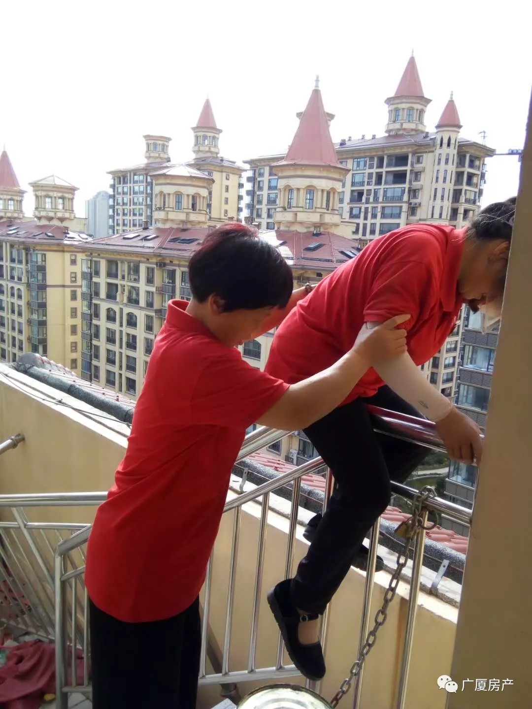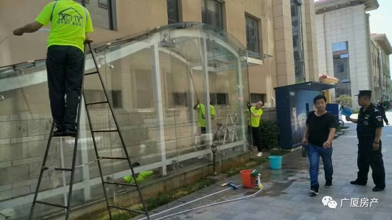 保潔員打掃樓房的天溝,樓房高大,她們的身影更高大。