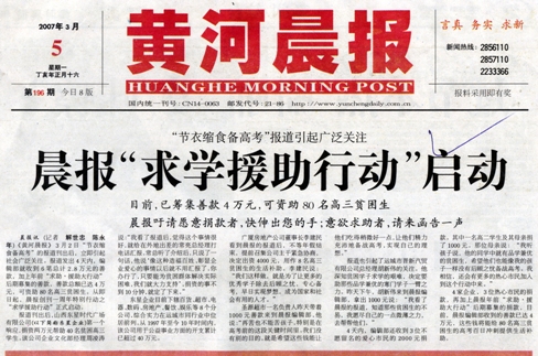 晨報(bào)訊(記者謝世忠 陳永年)《黃河晨報(bào)》3月2日“節(jié)衣縮食備高考”的報(bào)道刊出后,立即引起社會(huì)廣泛關(guān)注。報(bào)道發(fā)出4天內(nèi),編輯部就收到6筆總計(jì)2.8萬(wàn)元的善款,加上年前“求助·援助大行動(dòng)”后期募集的善款,善款總額已達(dá)4萬(wàn)多元,可資助80名高三貧困生。從即日起,晨報(bào)創(chuàng)看一周年特別行動(dòng)之“求學(xué)援助行動(dòng)”正是啟動(dòng)。