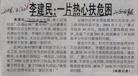 運(yùn)城市區(qū)和東西街路面坑坑洼洼,行人和司機(jī)叫苦不迭。2004年7月,廣廈公司投資30萬(wàn)元,組織員工整修路面300米,改造下水道500米,徹底解決了河?xùn)|西街多少年來(lái)行路難的問(wèn)題。